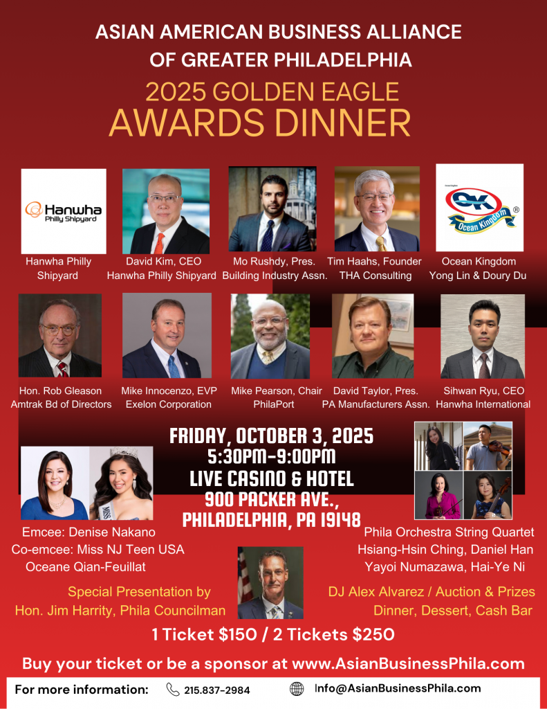 비영리단체 필라델피아 아시아계 미국인 비즈니스 연합(AABAGP, Asian American Business Alliance of Greater Philadelphia) 은 오는 10월 3일(금) 오후 5시 30분부터 9시까지 사우스필라델피아 라이브 카지노 & 호텔(LIVE! Casino & Hotel) 볼룸(900 Packer Avenue)에서 제1회 골든이글 어워즈 만찬을 개최한다.