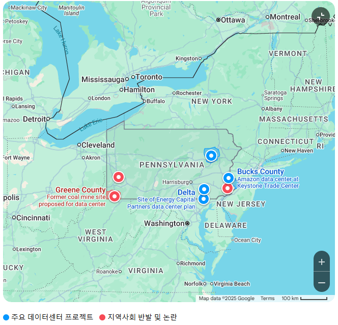 펜실베이니아가 AI(인공지능) 시대를 겨냥한 대규모 데이터센터 유치에 적극 나서고 있다. 펜실베니아주에서 진행되고 있는 주요 데이터센터프로젝트와 이로인한 지역사회의 반발과 논란이되는 지역. 출처:구글
